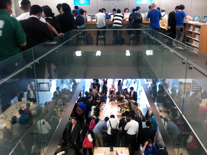 そういえば、ママボリンケンが当日分も若干あると新聞にあったよ、と、朝出掛けに言っていた事を思い出しながら、水をグビグビ。並んでいるよりも、まずは現物を触ろう!と店内へ。数分待って、ようやく触れたiPadを、舐めるようにあちこちいじりまくり、そのたびにため息と驚嘆。iPadを手にしたらどんな使い方が自分に取ってベストか...なんて冷静ではいられなくなるので、横で待っている人に渡しました。店先で案内している顔見知りのスタッフとばったり。どんな機種が出ているとか質問しながら色々話を聞きました。フトと行列を見ると、25人ぐらいに列が減っている。ふらりと誘われるように、まぁ、洒落で、再び列へ。iPhoneでメールチェックしていると、吉祥寺で触ったよん、というメール。「今並んでいるんだけど...」なんて電話していると、なにやら列が急に進み、スタッフの動きが激しくなり、これまた顔見知りのスタッフと目が合ってしまいました。そして、スルスルと2Fへ案内されてしまいました。