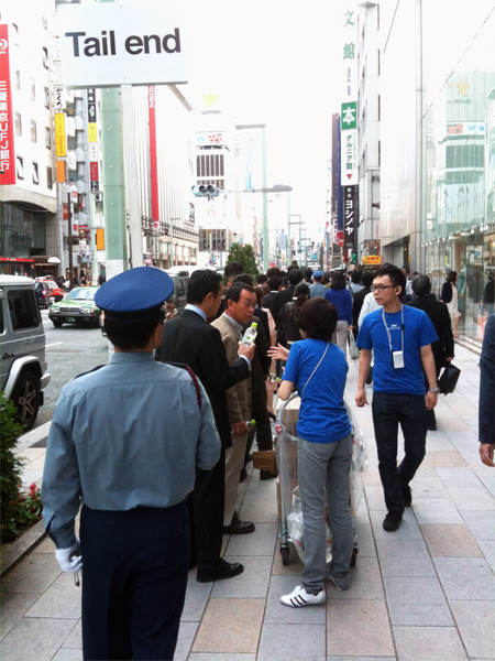 仕事の移動中に寄った、銀座。1200人が並んだとiPhoneでチェックを入れていたので、冷静に静かに穏やかにAppleStoreへ向かいました。BLOGのネタとして、発売日に立ち寄る=決して買えなくても、まぁ、そこは記念すべき日に立ち会う、それだけでもAppleファンとしてのオツトメなのではないか、と。着いてみると、まだ50人程の行列。ほほ〜、手続きに時間がかかっているんだなぁ。とりあえず、洒落で並んでみるかと最後列に。スタッフが台車に水を乗せて配りながら、前の人と話をしているのを聞いてると、