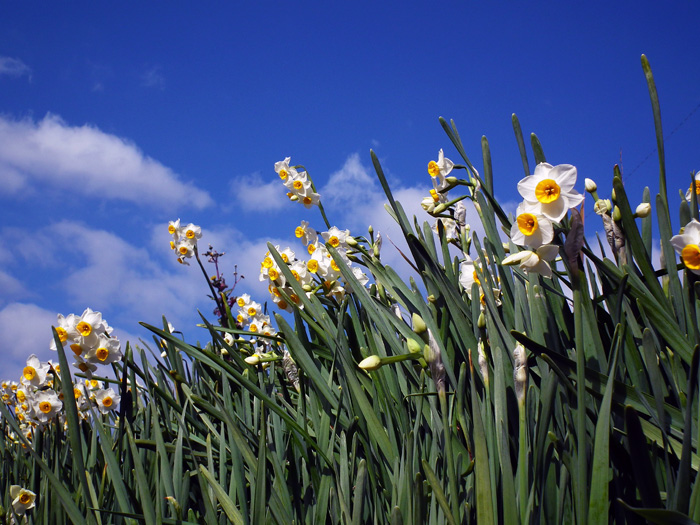 江戸時代から続く鋸南町保田の水仙は、淡路島、越前と共に日本三大水仙群生地に選ばれるほど。約3kmの山道を水仙の香りを楽しみながらのんびりと山登り。さほど寒くなく穏やかな午前中にとりとめのない話をしながら二人で。私は写真を、ママボリンケンはちょっと変ったものも探しながら、急な坂では腰から下の動きを気にしながら。午前中に到着したので、空気も澄んで真っ青な空と水仙の可憐な姿が目に眩しいほどです。水仙に覆われた斜面に囲まれた山道、段々畑のように山に向かって広がる水仙、やわらかい風に首をかしげるように揺れる水仙、逆光にちょっとおすましした水仙。花言葉の、ナルシスト、自惚れ、プライド、高潔...などの全てを知ってしまいそうな、そんな不思議な感覚です。