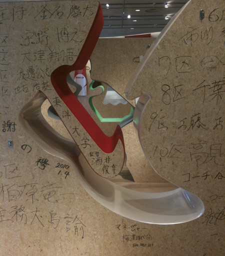 新しいシューズを探しに原宿のフラグショップへ。これは、ナイキ好きではなくても一度は行ってみたいい場所です。溢れんばかりのアイテムに囲まれて気持ちも盛り上がります。何でも、箱根駅伝の優勝校東洋大学のメンバーを交えたトークショーもかなりの盛り上がりだったそうです。店内には、東洋大学のメンバーのサインがされたオブジェも展示してあり、盛り上がっています。往路のスター的存在、柏原選手のサインは右写真をクリッすると拡大されます。